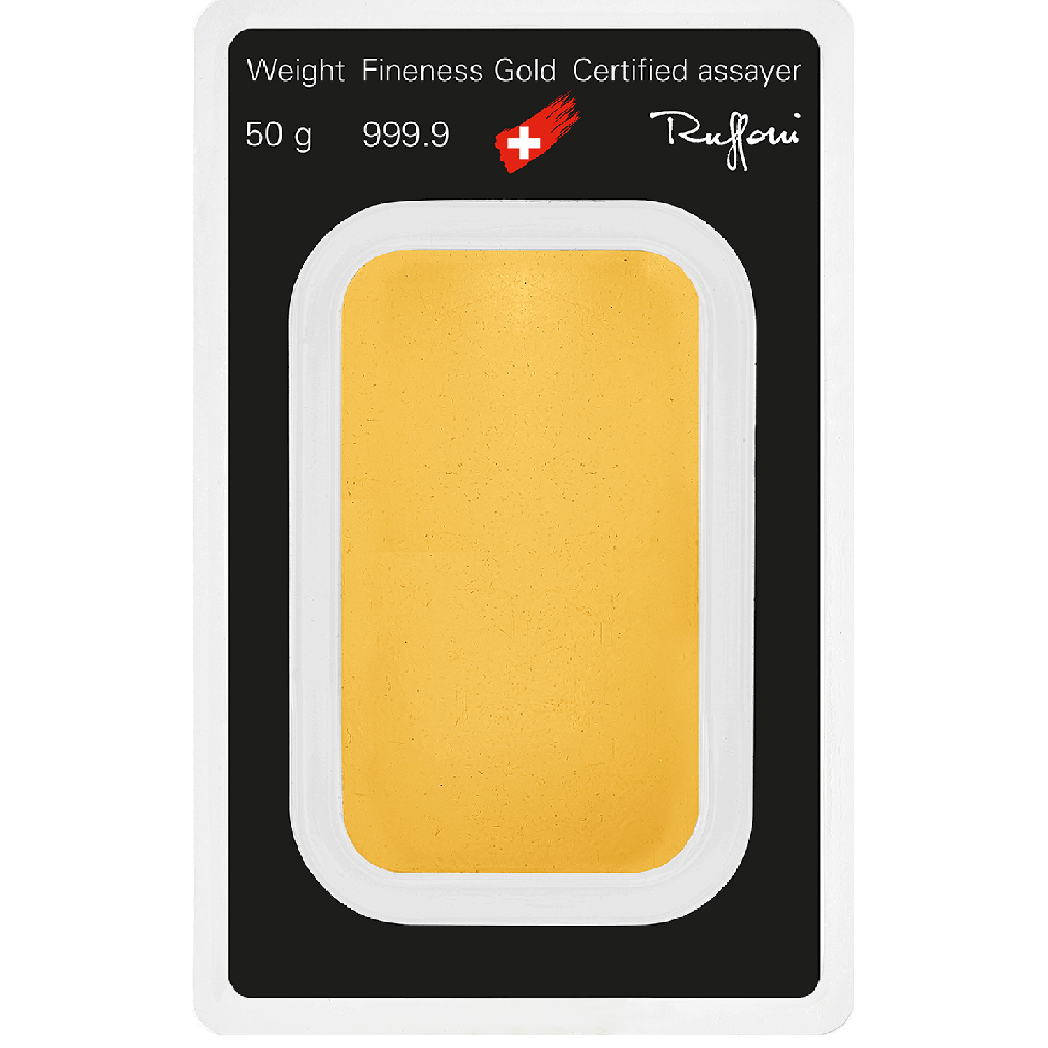 Each individual bar is shrink-wrapped in a special protective film. The dimensions of this blister card are 54 x 85 mm (credit card format). The 50 gram gold bar itself has a size of 49.65 x 28.45 x 1.95 mm.